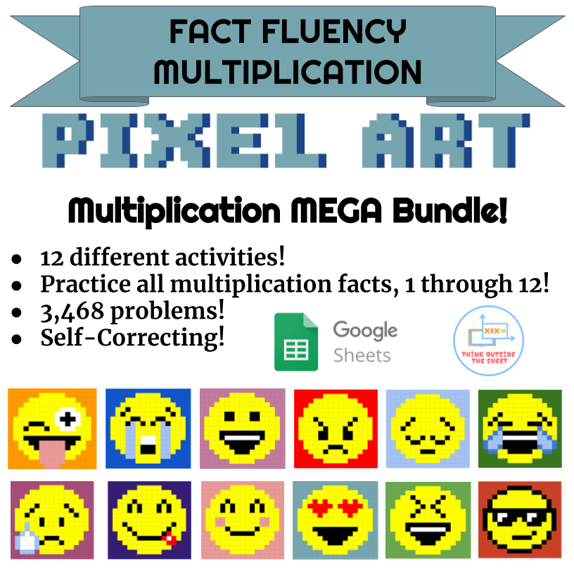 Practice all multiplication facts, from 1x2 up to 12x12. There is one activity dedicated to each factor. For example, the winky emoji activity is multiplying every number by 2. The last activity is a mixed spreadsheet involving all factors up to 12.