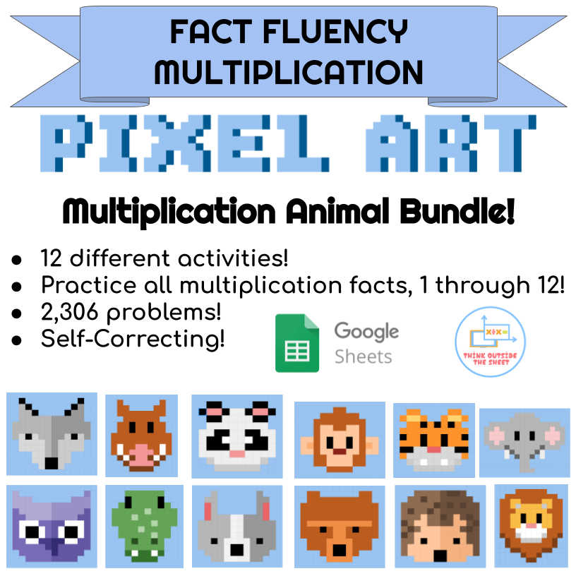 My very first and most popular bundle! Practice all multiplication facts, from 1x2 up to 12x12. There is one activity dedicated to each factor. For example, the bananas activity is multiplying every number by 2. The last activity is a mixed spreadsheet involving all factors up to 12.